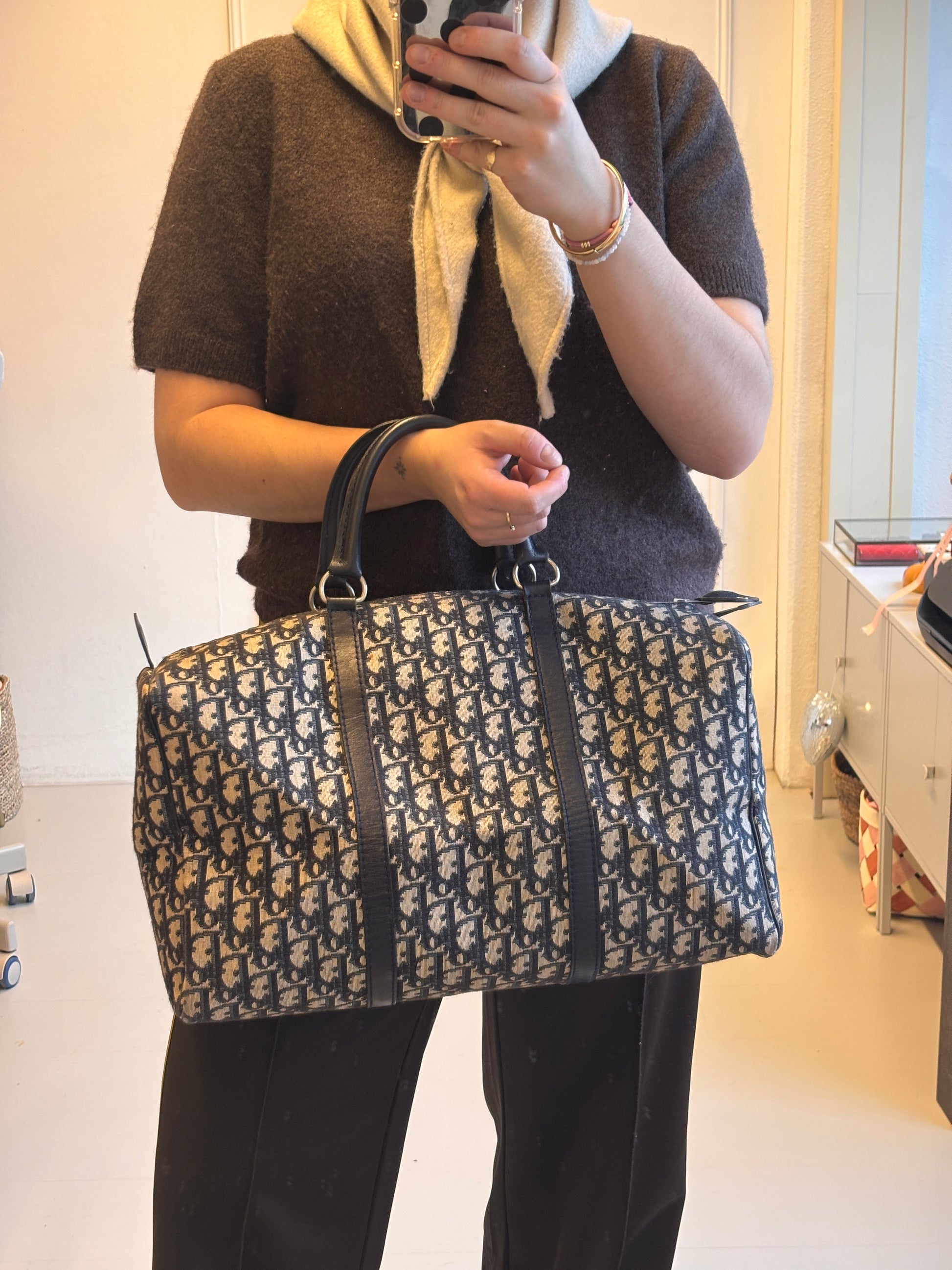 De Christian Dior Trotter Canvas Boston Bag is uitgevoerd in het iconische Trotter-motief in diep navy blauw. Het Boston-model biedt een ruime binnenkant, ideaal voor dagelijks gebruik of als compacte weekendtas.