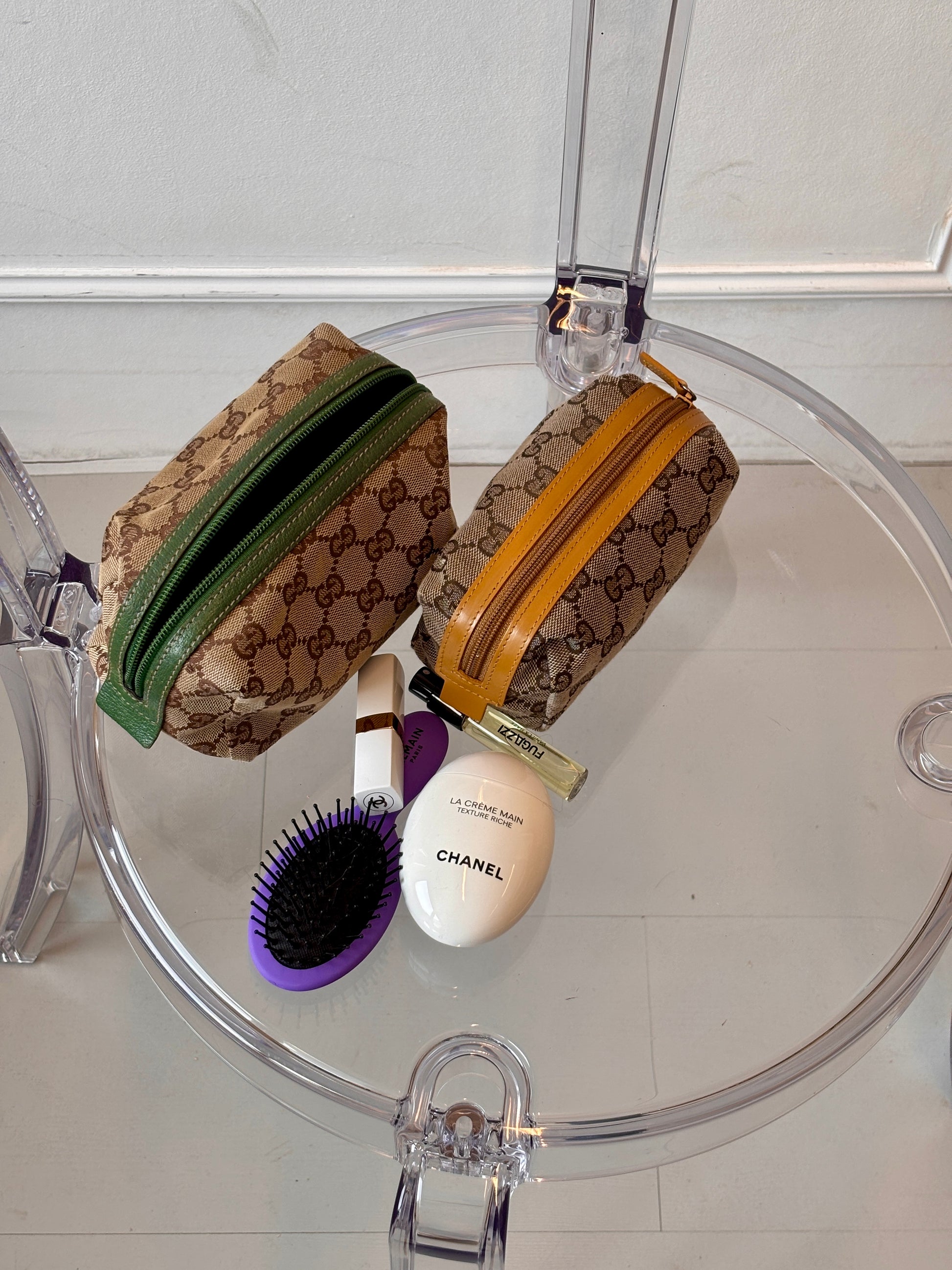 De Gucci GG Canvas Pouch combineert het iconische GG-canvas met oker/mosterdgele leren details, wat zorgt voor een warme en stijlvolle uitstraling. Het compacte maar handige formaat maakt de pouch ideaal voor het veilig opbergen van make-up, sleutels, kleine essentials of als praktische bag-in-bag in een grotere tas.